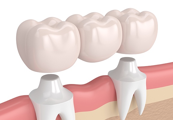 A dental bridge is a restoration that contains two dental crowns placed on either side of an artificial replacement tooth, called a pontic. The crowns are attached to your natural teeth on either side of the gap in your smile to hold the pontics in place. The restoration is stable and secure, so you can continue eating the foods that you enjoy, just be mindful of eating sticky, chewy, and hard items that could damage your restoration. Bridges are most commonly crafted from natural-looking materials such as porcelain, which makes them virtually indistinguishable from home-grown pearly whites.
